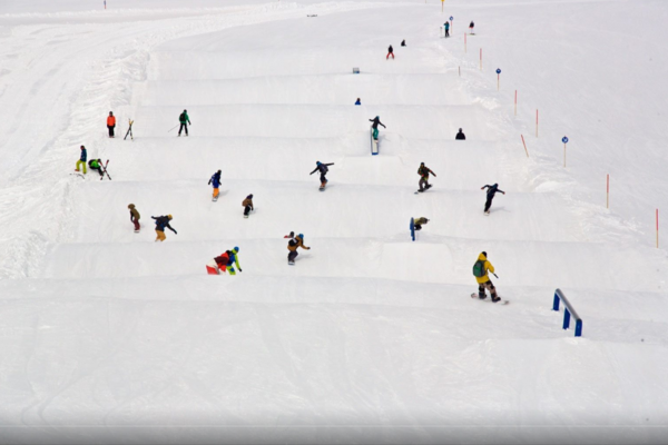 De rest van de dag skiën/boarden alle jongeren samen met hun eigen monitoren, rekening houdende met hun niveau.