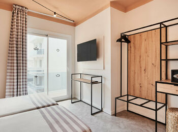 De kamers in de tent Lloret de Mar zijn ruim en praktisch ingericht en aan deze kamer is een terras.