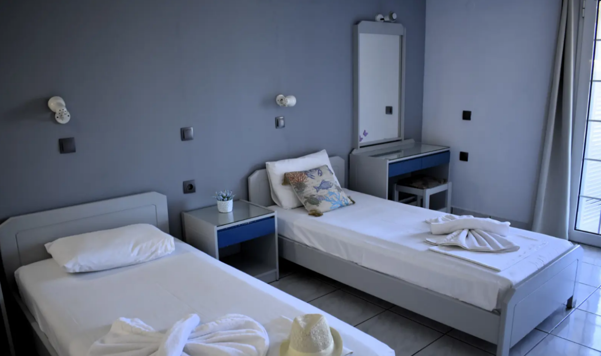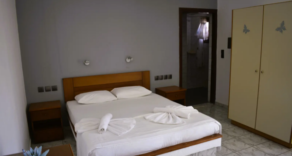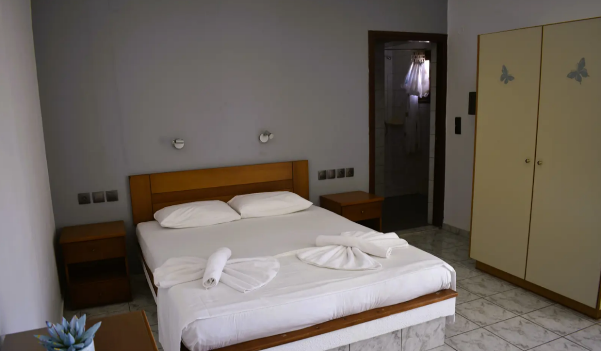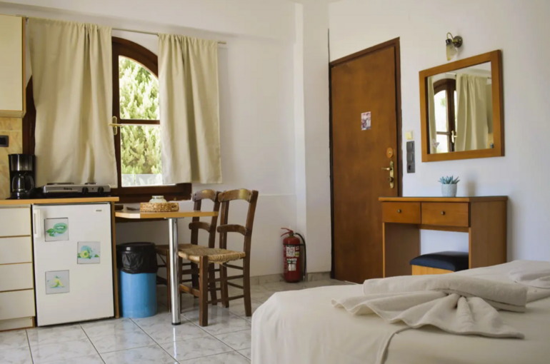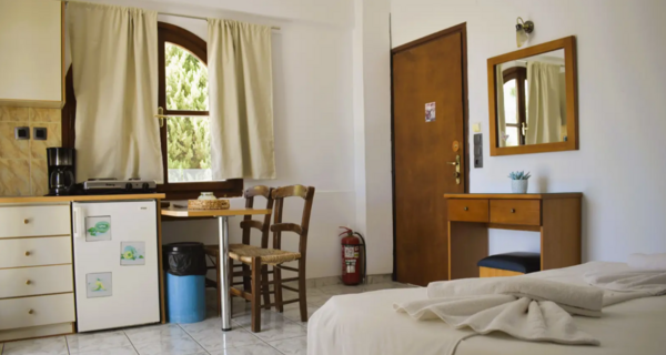 De studio (1-2 personen) in Villa Myrto is eenvoudig maar netjes en beschikt over een airconditioning (tegen betaling), kluisje (tegen betaling), een kitchenette met koelkast en 2-pits kookplaat en een balkon of terras met zitje. De badkamer is voorzien van een douche, föhn en toilet.